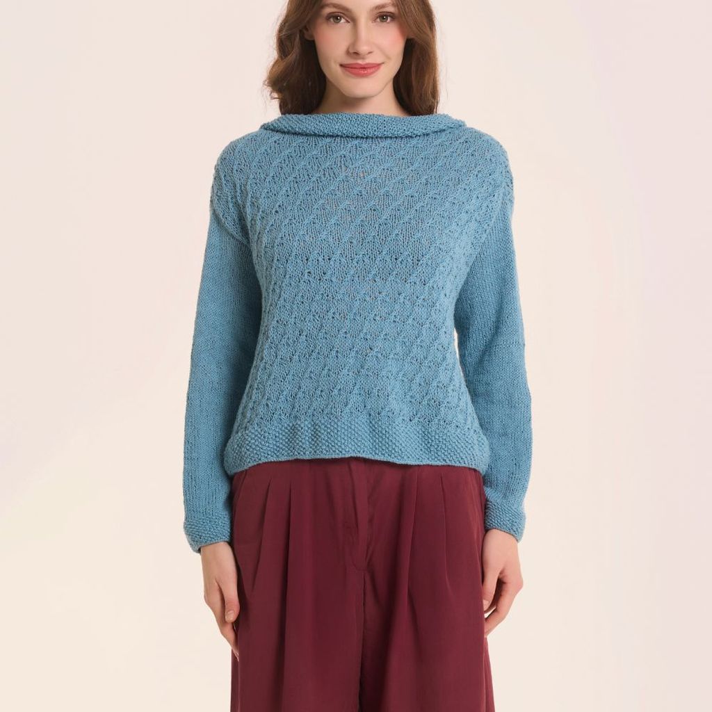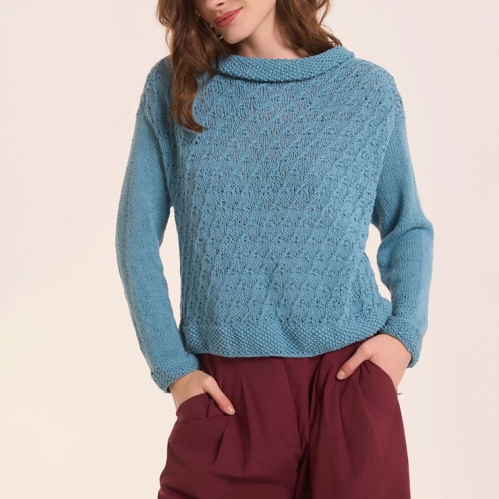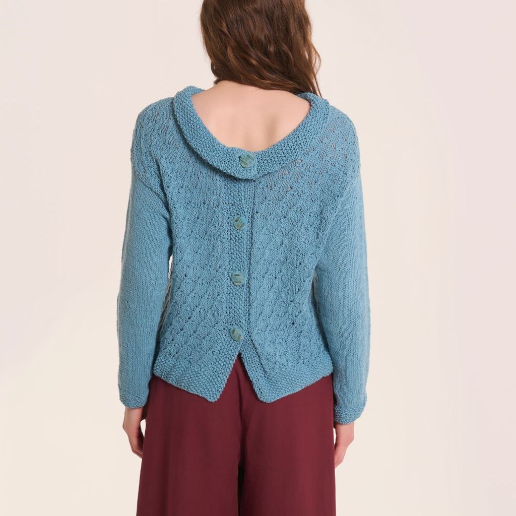 Il capo è lavorato in piano (andata e ritorno) e senza cuciture, con la tecnica top down (dall'alto verso il basso). Le maniche sono realizzate con la tecnica del magic loop in tondo, sulla base delle m degli scalfi. Le indicazioni di seguito sviluppano la taglia S, per le altre taglie seguire le indicazioni tra parentesi (M-L-XL).