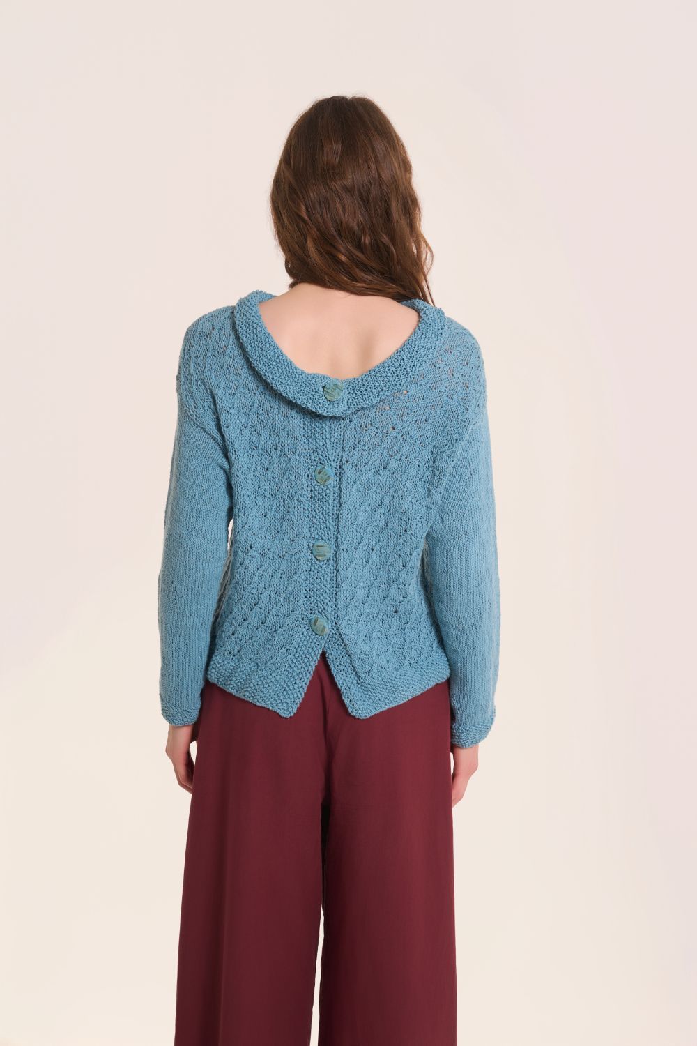 Altro: ferretto per trecce, ago da lana con la punta arrotondata, marcapunti, forbici, metro a nastro, fili di scarto per lasciare in sospeso le m, 4 bottoni con il diametro di 2,5 cm.