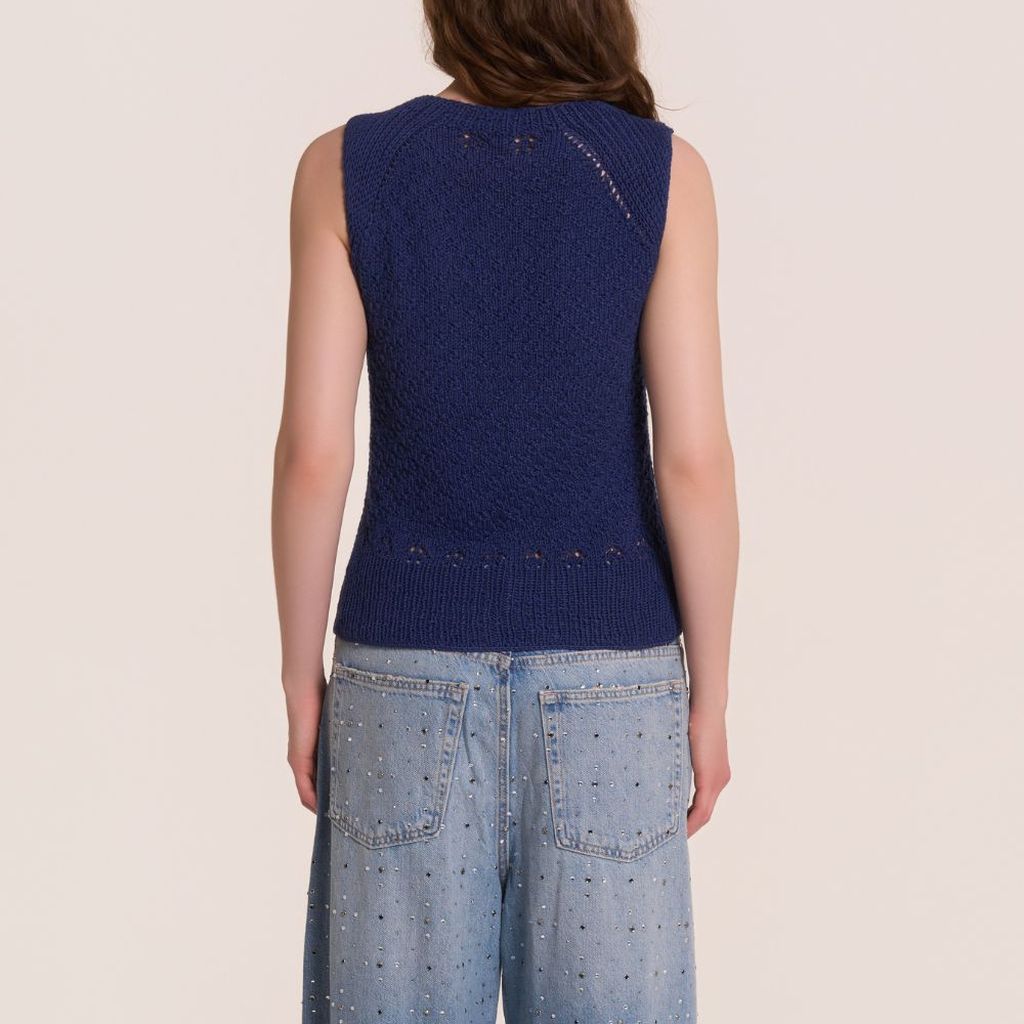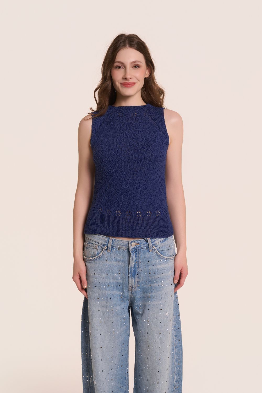 Passare tutte le m del davanti e del dietro, su un cavetto da 100 cm, avviando a nuovo 3 m tra i 2 gruppi di maglie, sia su un lato che sull'altro, chiudere in tondo e inserire un MPI. Proseguire lavorando i bordi laterali a coste 1/1 e la parte del davanti e del dietro seguendo lo schema del punto fantasia. Il 1° giro corrisponde al 5° f. dello schema allegato.