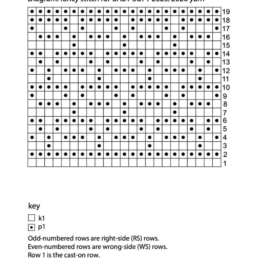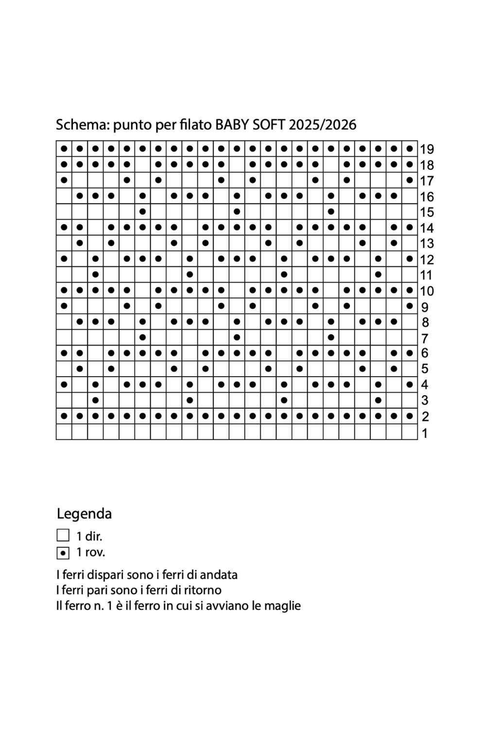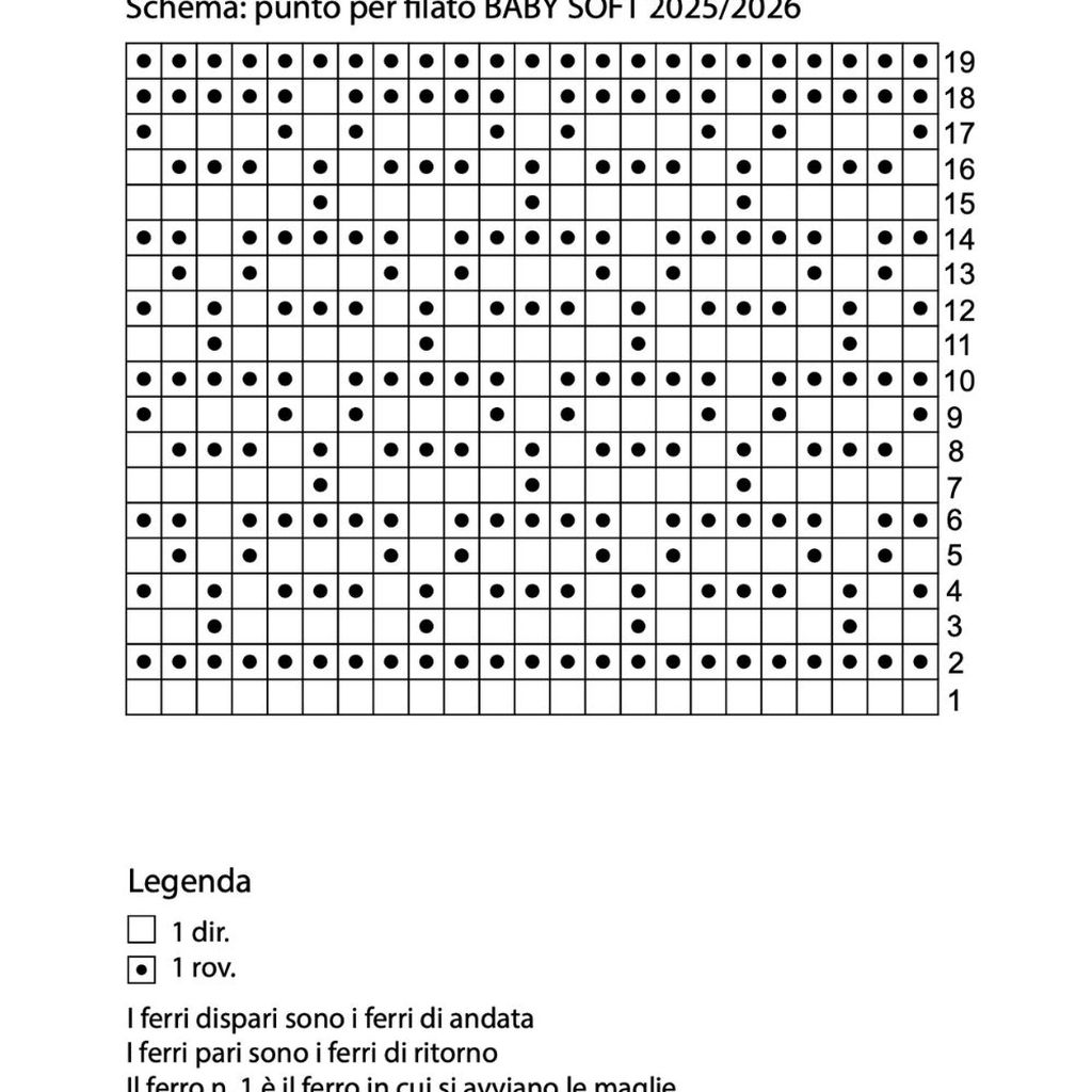 Per le taglie diverse dalla S, nell’esecuzione del punto fantasia, l’inizio del ferro rimarrà identico per tutte le taglie, mentre la fine della sezione a punto fantasia varierà in base al numero di maglie previste.