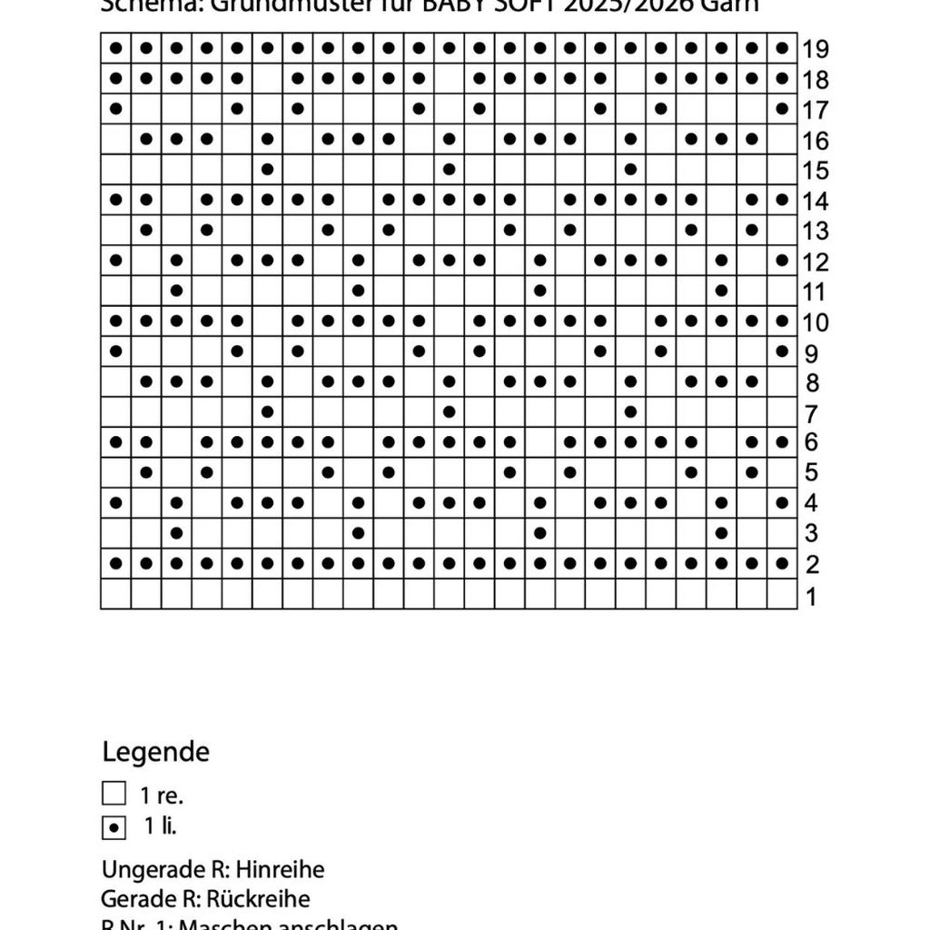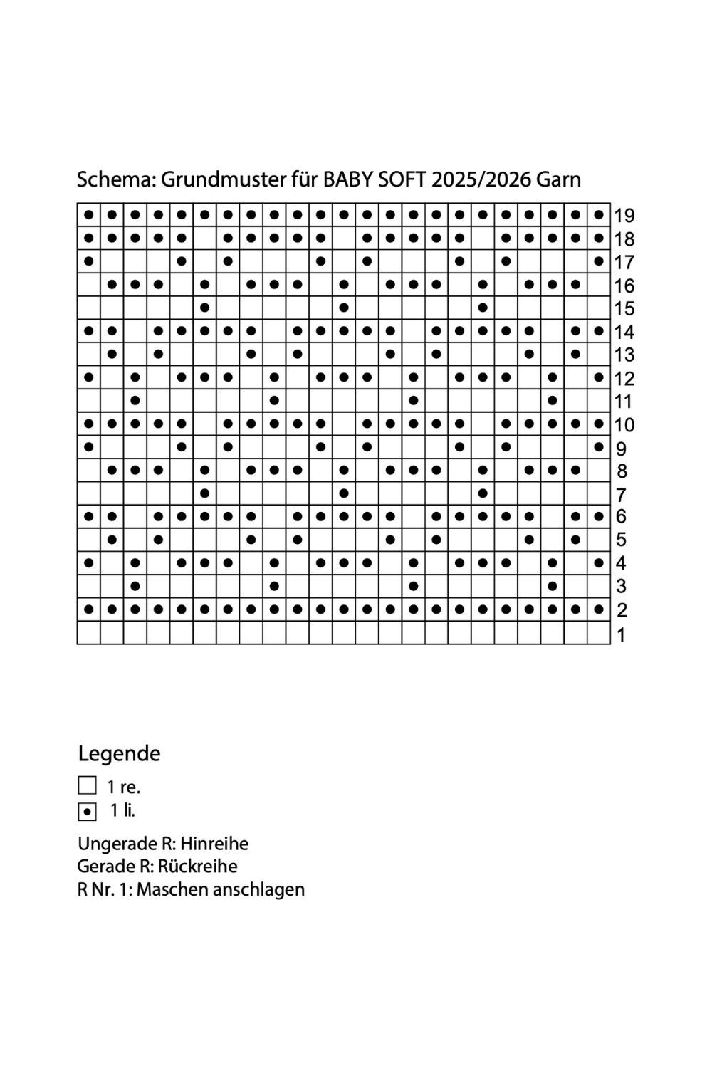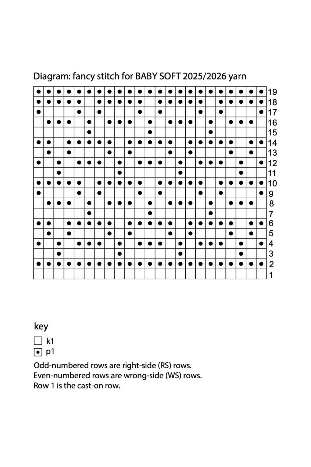 Per le taglie diverse dalla S, nell’esecuzione del punto fantasia, l’inizio del ferro rimarrà identico per tutte le taglie, mentre la fine della sezione a punto fantasia varierà in base al numero di maglie previste.