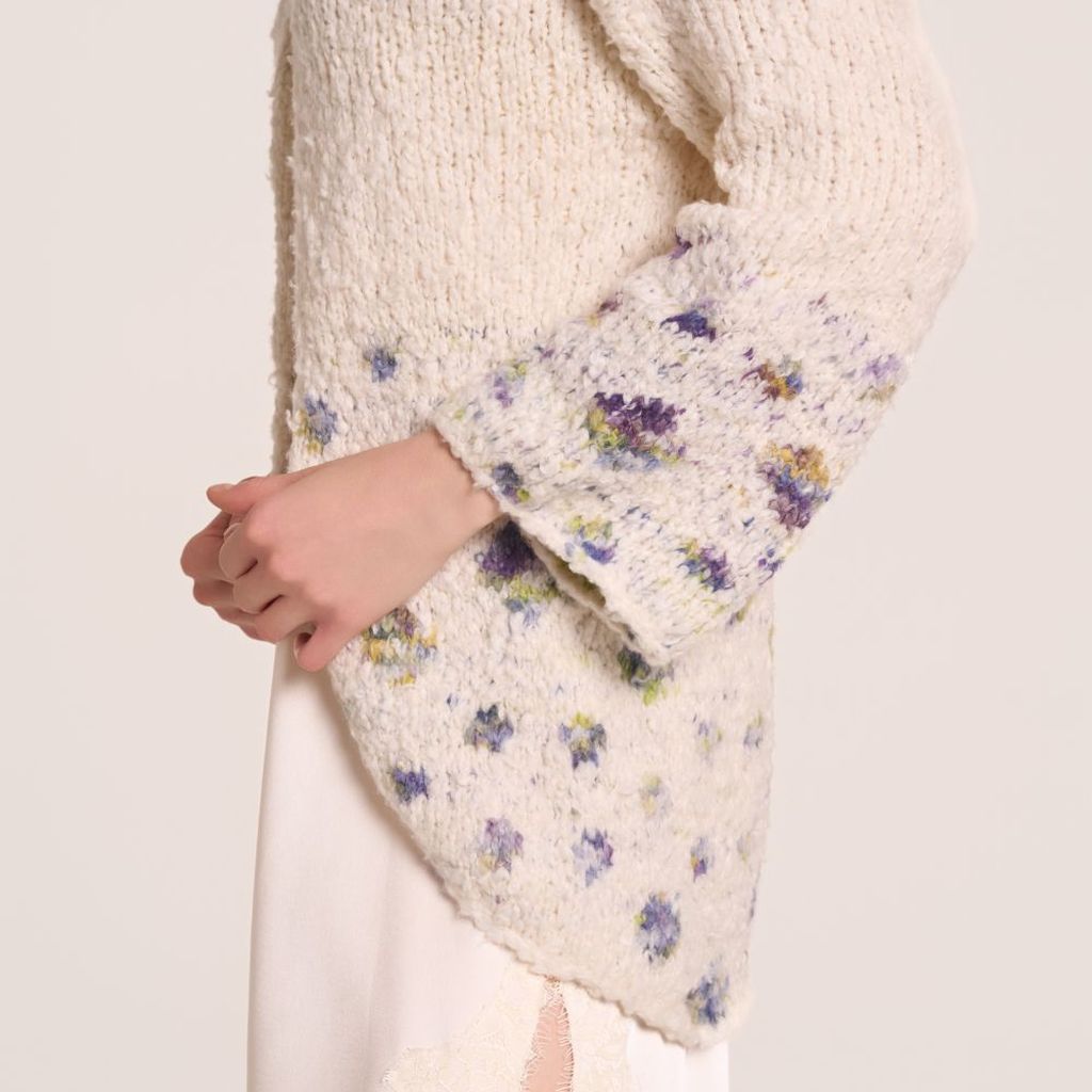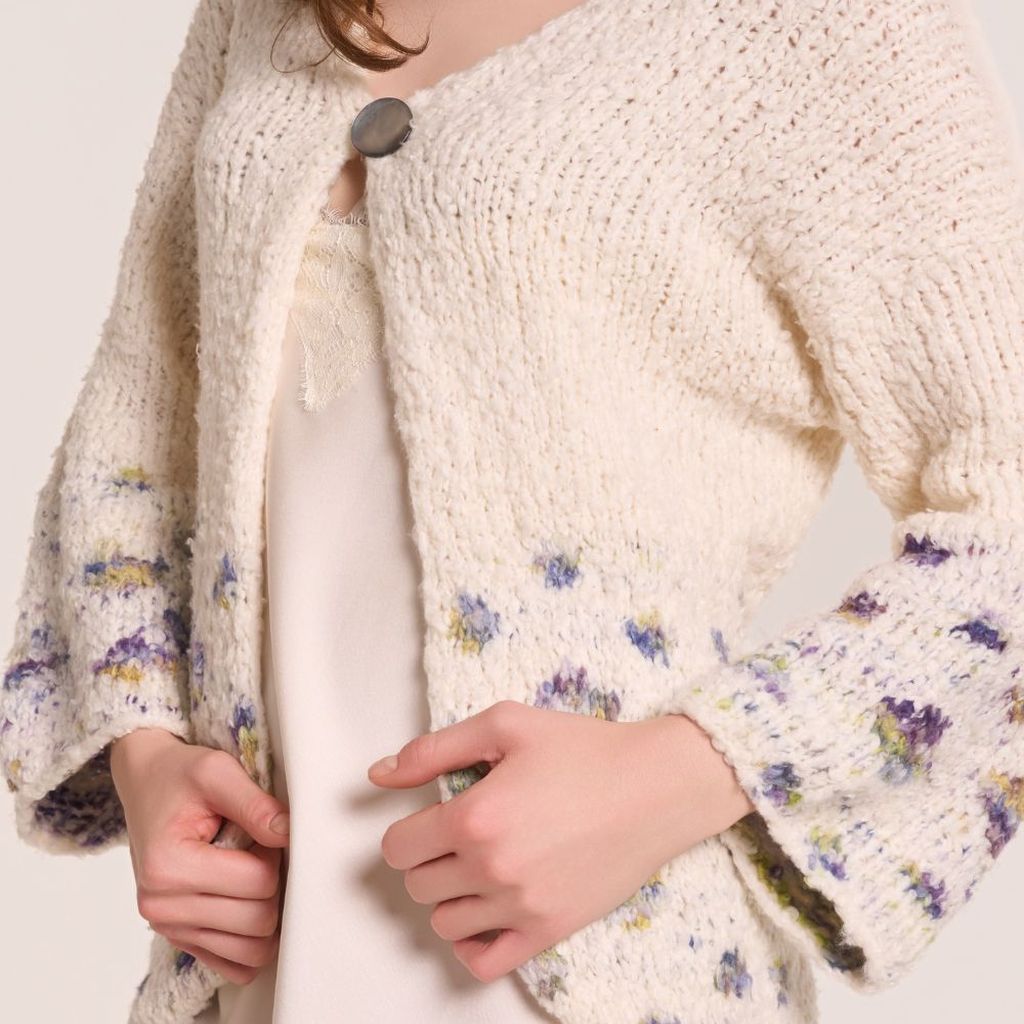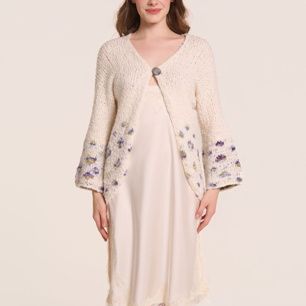 Con l'unc e il filato Plume col 1, eseguire un giro di rifinitura a mbss (LD) attorno al perimetro del cardigan (margine inferiore, davanti destro, scollo e davanti sinistro). Rifinire allo stesso modo i polsini.