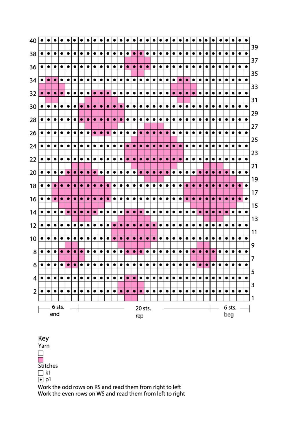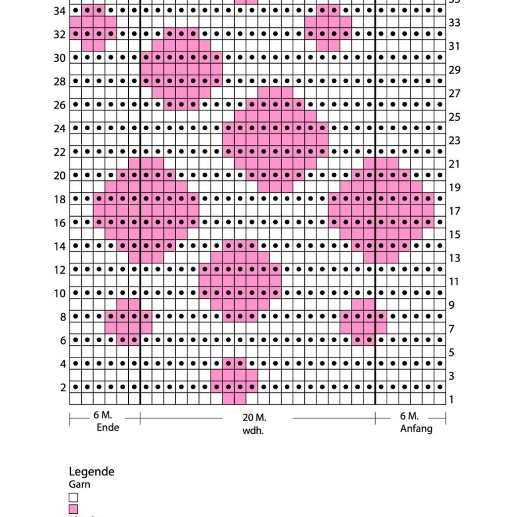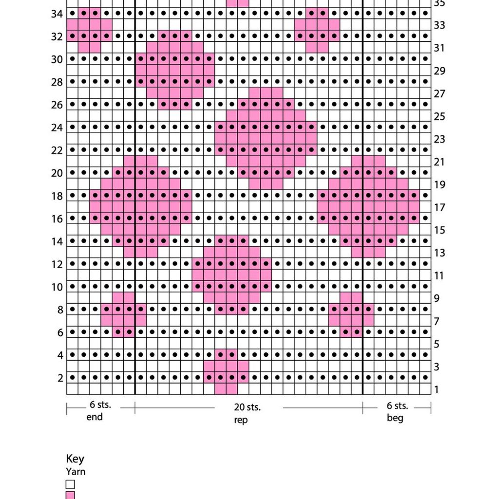 Lavorazione jacquard: usare contemporaneamente i 2 colori indicati, alternandoli come mostra lo schema e seguendo le istruzioni. Quando si cambia colore, attorcigliare insieme i fili dei 2 colori per non lasciare un buco, poi trasportare il filo del colore che non serve sul LR, pronto per essere ripreso al prossimo cambio colore.