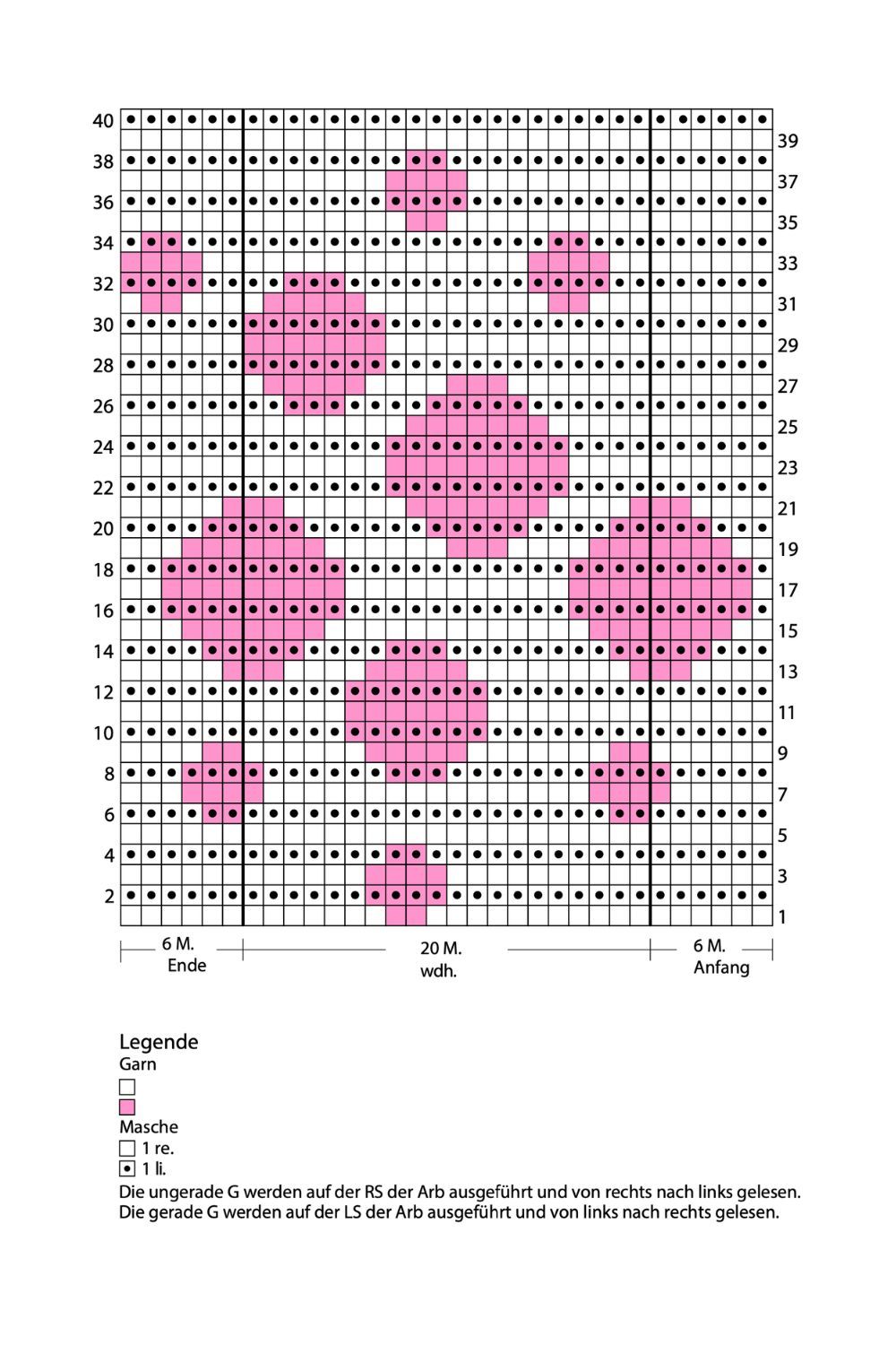 1° f (LD): unire un nuovo filo e lav a dir 18 (20-22-24) m, girare e passare la 1a m. *Tirare il filo verso l'alto sopra il ferro in modo da creare una maglia doppia con 2 “gambe”. Tenere il filo teso e continuare a lavorare. Quando successivamente si incontra la maglia doppia, lavorare entrambe le “gambe” come una sola maglia *.